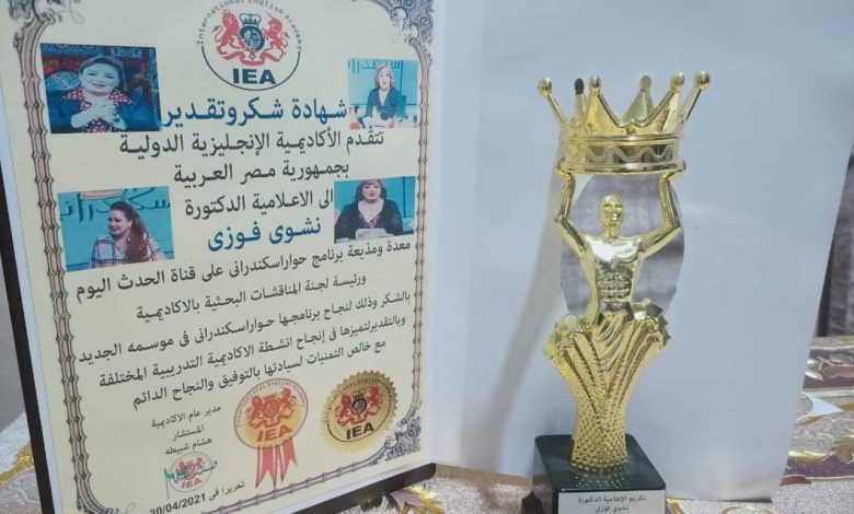 هشام شبيطة يكرم الدكتورة نشوى فوزى لتميزها فى مهامها الإشرافية ومتابعة الباحثين بالأكاديمية الإسكندرية كلمة العرب انعقدت أمس مساء الجمعة الموافق ٣٠ابريل ٢٠٢٠م لجنة المناقشات البحثية بقاعة الأكاديمية الانجليزية الدولية برئاسة الدكتورة نشوي فوزي معدة ومذيعة برنامج حوار اسكندراني وتم تكريم سيادتها علي تميزها في مهامها الاشرافيه ومتابعة الباحثين قدم المستشار /هشام شبيطه مدير عام الاكاديميه الانجليزيه في مصر وممثلا عن مجلس إدارة الأكاديمية درع التكريم لسيادتها في وجود المستشار الجليل /احمد عوض عضو هيئة المناقشة بالأكاديمية ونتمني لها التوفيق والنجاح الدائم بعون الله ارق تحيات أسرة الجريدة