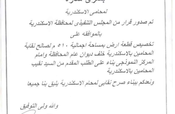 اصدر المجلس التنفيذي لمحافظة الاسكندريه قرار بالموافقه علي تخصيص قطعه ارض بمساحة اجماليه خمسمائة وعشر مترا لصالح نقابه المحامين بالاسكندريه