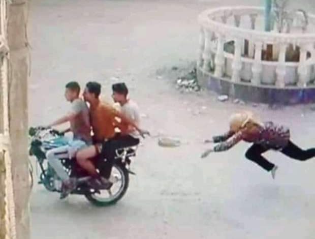 متداولو الصور قالوا إن الواقعة حدثت في مركز كفر صقر بمحافظة الشرقية ويظهر فيها 3 أشخاص يستقلون دراجة بخارية أحدهم يسحب حقيبة الفتاة بهدف سرقتها فيما تشبثت الفتاة بالحقيبة ما أدى إلى سحلها في الشارع