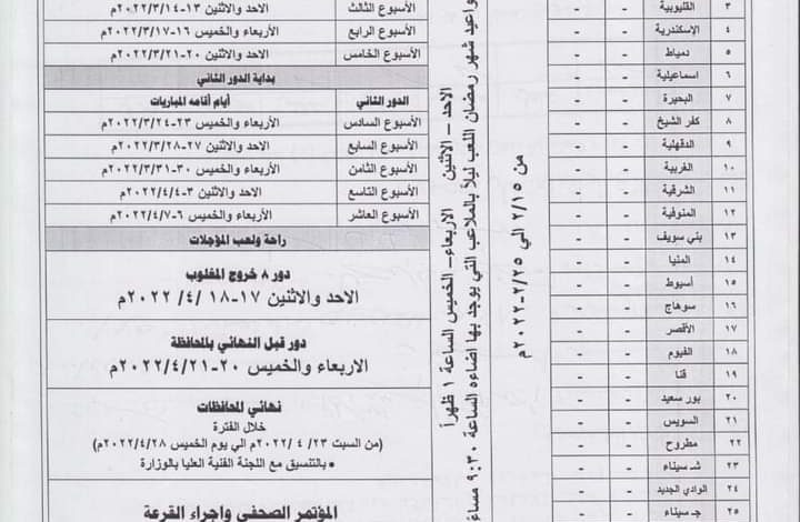 وانطلق الدوري في مختلف محافظات الجمهورية أمس 6 مارس بمنافسات الأسبوع الأول ، إنتهاءً بالإسبوع العاشر 6-7 إبريل القادم ، ثم ينطلق دور الثمانية بالمحافظات 17-18 من ذات الشهر ، وصولاً بالمباراة النهائية بكل محافظة من23-28 إبريل القادم ، يعقب ذلك المؤتمر الصحفي ل 27 فريق أبطال المحافظات و5 فرق تواني المحافظات عن طريق القرعة بينهم وذلك في أحدي أيام 9،10،11 مايو القادم.وتنطلق الأدوار النهائية بين أبطال المحافظات بدءً من 15-18 مايو ، ودور 16 من 22-24 مايو ، ودور8 من 29-30 مايو ، دور 4 من 5-6 مايو ،وتحديد الثالث والرابع الأربعاء 8 يوينه ، والمباراة النهائية منتصف يونيه.وجاءت تفاصيل الجدول؛ الأسبوع الأول وحتي الثامن خلال شهر مارس ، والتاسع والعاشر خلال شهر إبريل.