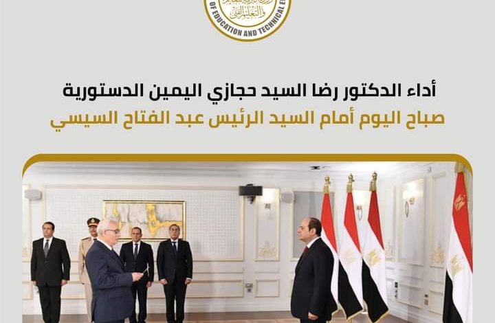 أداء الدكتور رضا حجازى اليمين الدستورى لتوليه منصب وزير التعليم أمام الرئيس عبد الفتاح السيسي صباح اليوم. الإسكندرية فريال مؤمن. أدى الدكتور رضا السيد حجازي اليمين الدستوري لتوليه منصب وزير التربية_والتعليم_والتعليم الفني، أمام السيد الرئيس عبد الفتاح السيسي، صباح اليوم بالقصر الجمهوري بمدينة العلمين الجديدة.