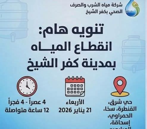 أعلنت شركة مياه الشرب والصرف الصحي بمحافظة كفر الشيخ قطع المياه اليوم الأربعاء، لتنفيذ أعمال تطهير وتعقيم دورية للخزانات الأرضية بمحطة مياه كفر الشيخ الرئيسية رقم (1)، ضمن خطتها المستمرة للحفاظ على جودة المياه وضمان مطابقتها للمواصفات الصحية القياسية المقدمة للمواطنين.