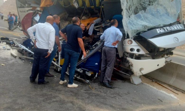 وفاة ٣ واصابة ٣٠ في حادث تصادم اتوبيس ركاب وسيارة نقل بطريق الجلالة